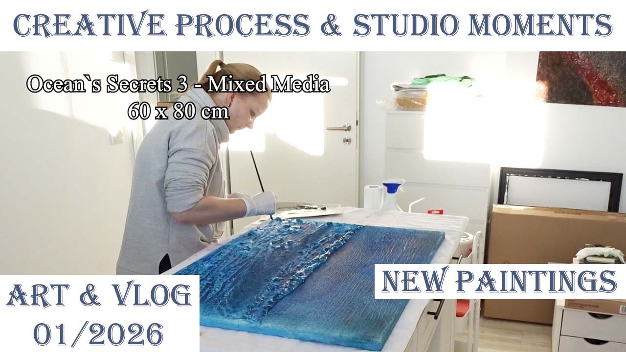 The Ocean’s Secrets series explores the mysterious depths of the underwater world. The mixed-media paintings combine complex shades of blue with relief-like structures reminiscent of currents, sediments, and hidden formations of the seabed. Characteristic is the interplay of tactile surface and color depth, creating the impression of diving into the hidden layers of the ocean. Subtle details such as stones or mineral textures reinforce the impression of a secret, unexplored world. Together, the series conveys an atmosphere of mystery and tranquility—a homage to the hidden secrets of the sea.